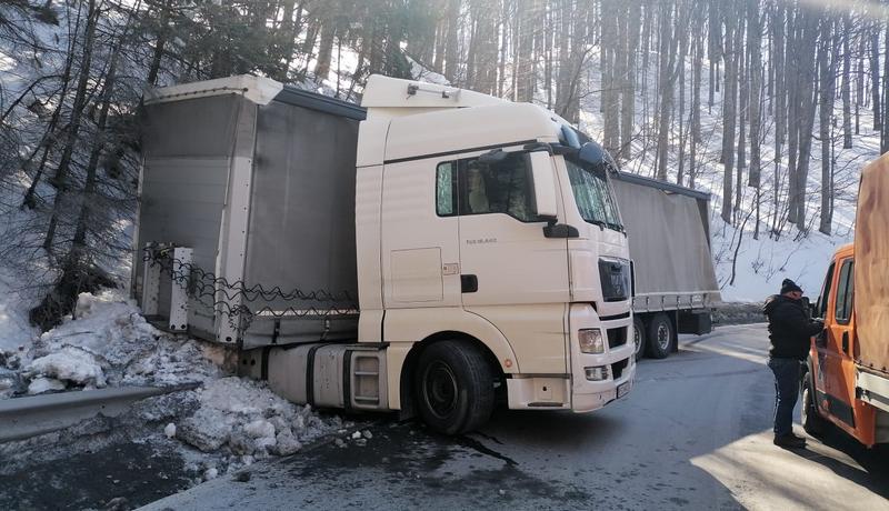Drumarii brașoveni au menționat că șoferul nu a adaptat viteza în curbă și a intrat cu remorca în șanț, iar cabina a rămas pe carosabil.