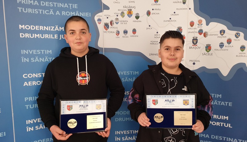 Ionuţ Agapie şi Andrei Iatan au fost felicitaţi şi aplaudaţi la scenă deschisă de plenul ATOP Braşov şi de preşedintele Consiliului Judeţean, Adrian Veştea.
