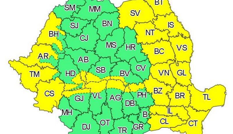 Cele 27 de judeţe vizate de atenţionarea Cod galben, unele total, iar altele parţial sunt: Alba, Argeş, Arad, Bacău, Bihor, Brăila, Botoşani, Braşov, Buzău, Călăraşi, Caraş-Severin, Constanţa, Dâmboviţa, Gorj, Galaţi, Hunedoara, Ialomiţa, Iaşi, Neamţ, Prahova, Sibiu, Suceava, Tulcea, Timiş, Vâlcea, Vrancea şi Vaslui.