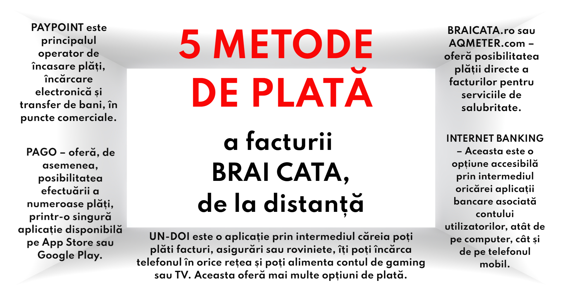 Aceste metode se adaugă altor metode plată de la distanță, care pot fi consultate pe braicata.ro, pe următoriul link ( https://www.braicata.ro/5-metode-rapide-prin-care-poti-plati-factura-de-salubritate-brai-cata/ ).