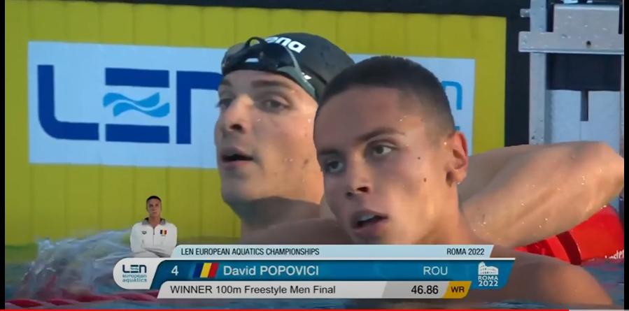 După cucerirea medalilor de aur de la Campionatele Mondiale de Natație de la Budapesta, de anul acesta, la probele de 100 și 200 de metri liber, David Popovici reușește din nou o performanță la seniori, de această dată la Campionatele Europene de la Roma, Italia, câștigând medalia de aur la proba de 100 metri și stabilind un nou record mondial în finala acestuia, cu un timp de 46,86s, doborând astfel recordul deținut din 2009 de brazilianul Cesar Cielo Filho cu timpul de 46,91s.