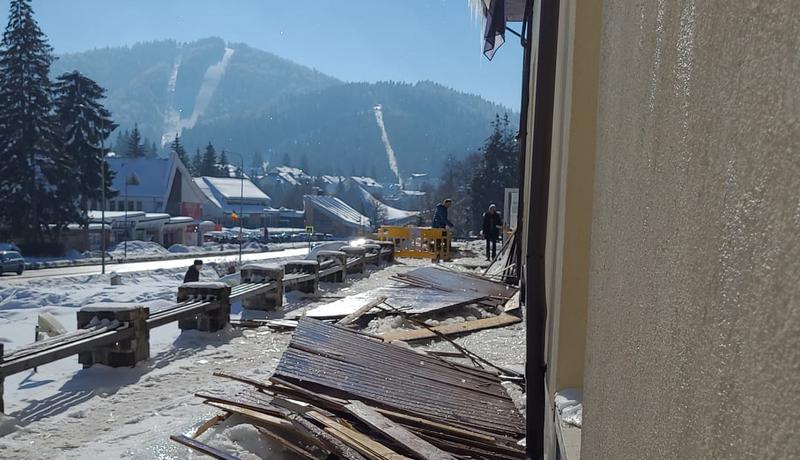 „Se infiltrase apă și exista riscul ca aceasta să înghețe și să provoace alte probleme. Am preferat să demontăm porțiunea respectivă, cu angajații Primăriei Predeal. Circulația pietonală în zonă a fost oprită încă de vineri. În momentul în care a fost demontată porțiunea de acoperiș, nu era nimeni în preajmă”, a declarat viceprimarul orașului Predeal, Marius Mateescu.