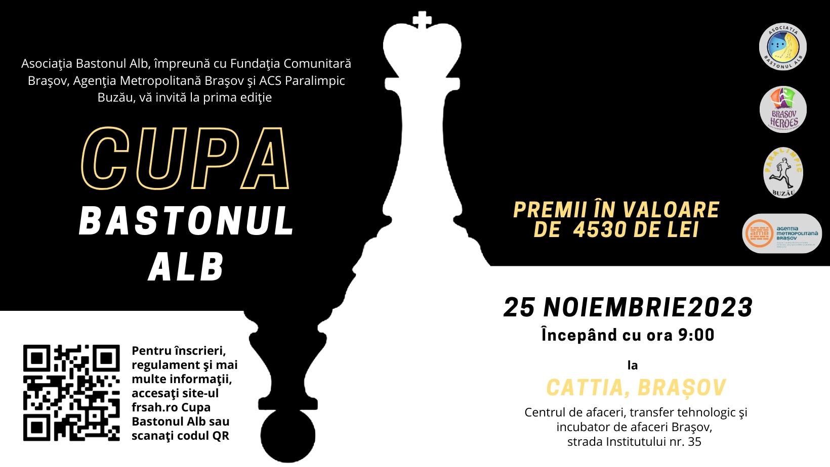 Asociația Bastonul Alb, împreună cu Fundația Comunitară Brașov, Agenția Metropolitană Brașov și ACS Paralimpic Buzău, are plăcerea de a invita pasionații, amatorii și jucătorii de șah cu sau fără experiență la prima ediție a Cupei Bastonul Alb, pe data de 25 noiembrie, începând cu ora 9:00, la CATTIA Brașov (Centrul de afaceri, transfer tehnologic și incubator de afaceri), pe strada Institutului nr. 35.