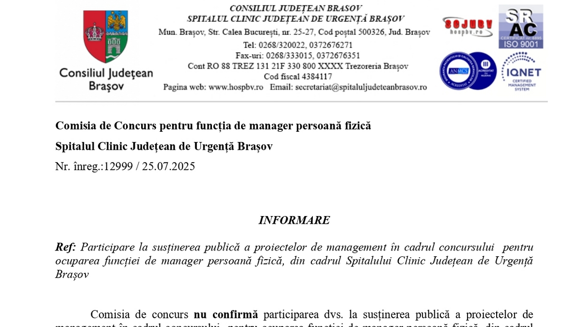 30 de minute de întârziere au fost suficiente pentru Comisia de Concurs ca să decidă că „nu se confirmă participarea”. Totul împachetat într-un răspuns frumos și oficial, cu antetul Consiliului Județean și al SPitalului Clinic Județean de Urgență Brașov, cu număr de înregistrare. Dar evident, nesemnat de o persoană, ci de „comisia de concurs”.