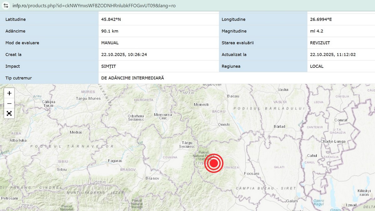Institutul Naţional De Cercetare – Dezvoltare Pentru Fizica Pământului (INCDFP ) a anunțat că în 22 octombrie 2025, la ora 10:23:26 (ora locală a României), s-a produs în Zona Seismică Vrancea (județul Vrancea) un cutremur mediu cu magnitudinea ml 4.2, la adâncimea de 90.1 km.