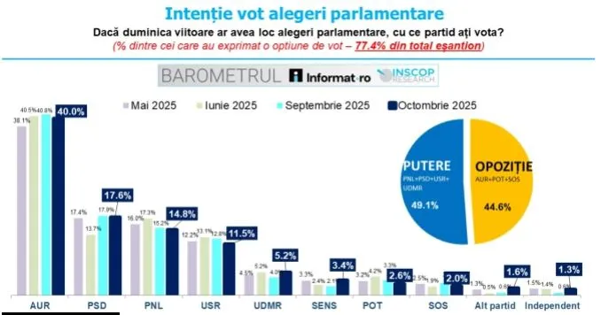 Comparativ cu luna septembrie, intențiile de vot rămân relativ stabile. În precedentul sondaj INSCOP, de luna trecută, AUR era cotat la 40,8%, PSD la 17,9%, iar PNL la 15,2%.