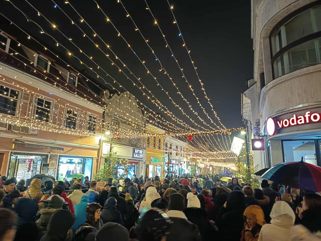 VIDEO – FOTO. Peste 1,3 milioane de beculețe, în zona centrală a Brașovului. În Piața Sfatului a fost dat startul Sărbătorilor de iarnă