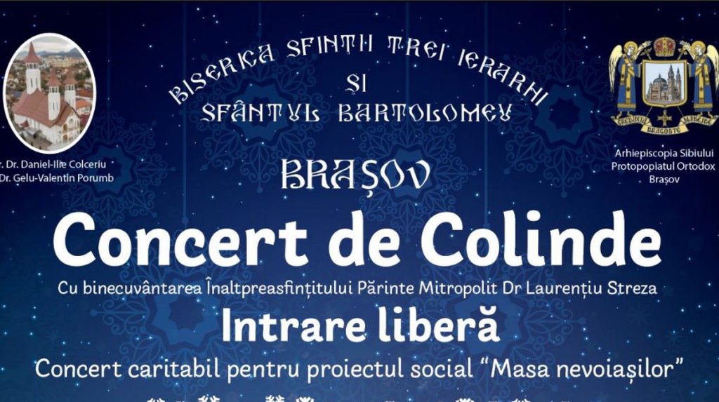 Brașovenii sunt așteptați duminică, 14 decembrie, la Biserica Sfinții Trei Ierarhi și Sfântul Bartolomeu, de pe strada Lungă nr. 275 din Brașov la un concert special de colinde.