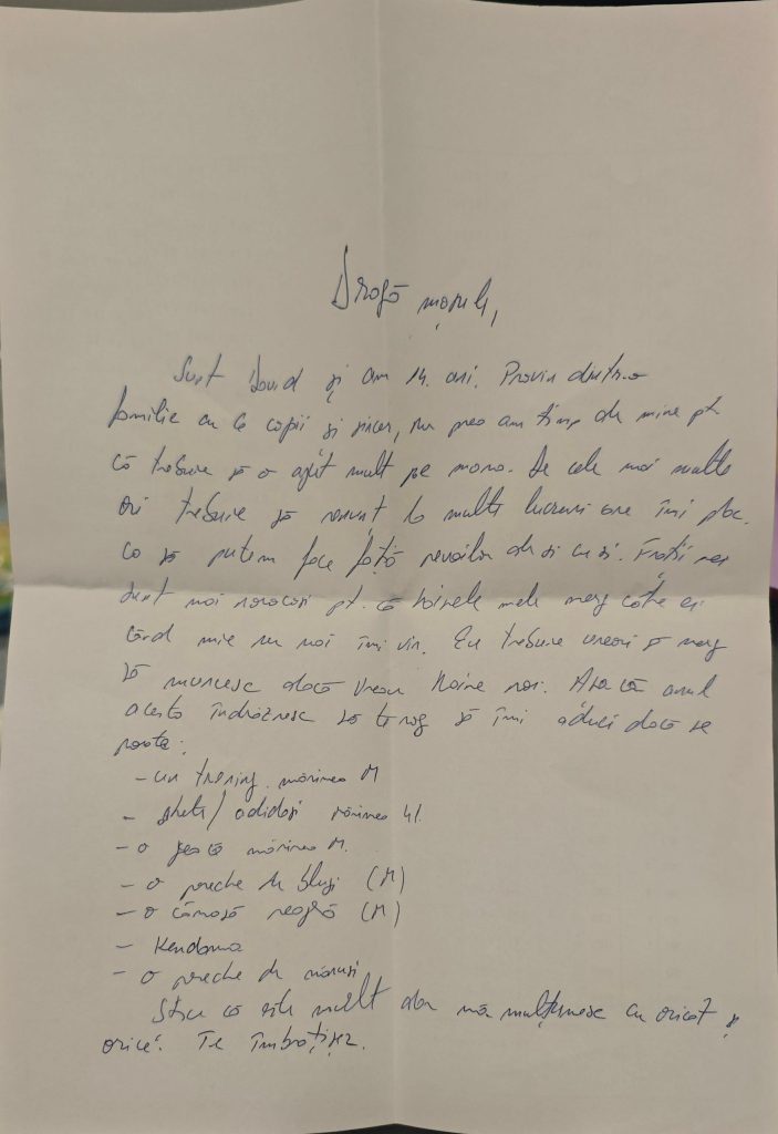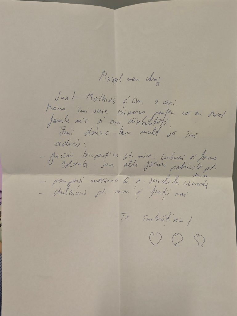 „Moșul meu drag, sunt Mathias și am 2 ani… Mama scrie pentru mine pentru că sunt foarte mic și am dizabilități. Îmi doresc jucării terapeutice…” „Îmi doresc bomboane pentru mine și frații mei.”