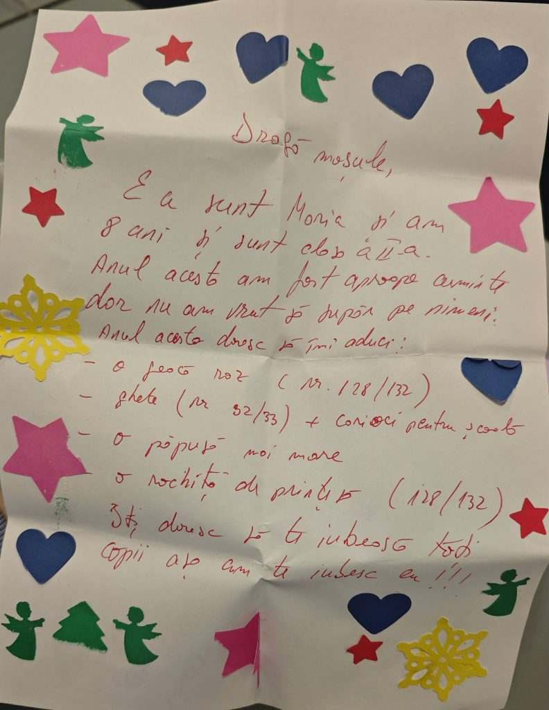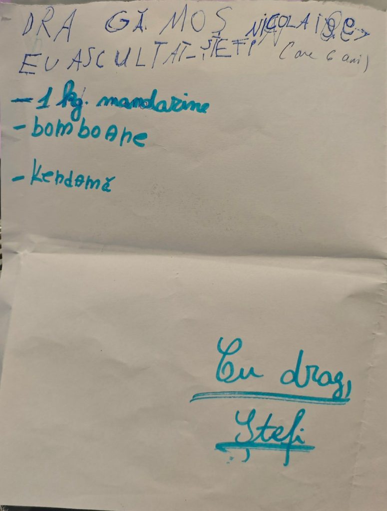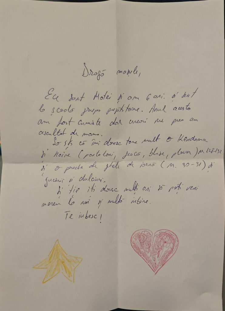 „Draga moșule, eu sunt Matei și am 6 ani… îmi doresc o geacă, ghete și dulciuri. Și ție îți doresc mulți ani să poți veni mereu la noi. Te iubesc!”