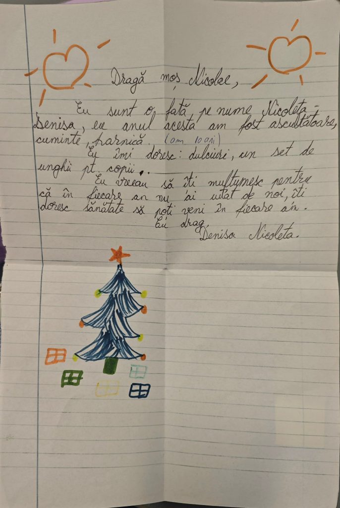 „Eu sunt Nicoleta, am 10 ani și îți mulțumesc că nu ai uitat de noi. (…) „Am fost cuminte, ascultătoare. Îmi doresc dulciuri.”