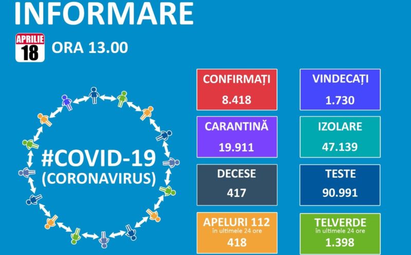 Astăzi, 18 aprilie, pe teritoriul României, au fost confirmate 8.418 de cazuri de persoane infectate cu virusul COVID – 19 (coronavirus), cu 351 față de ieri,...