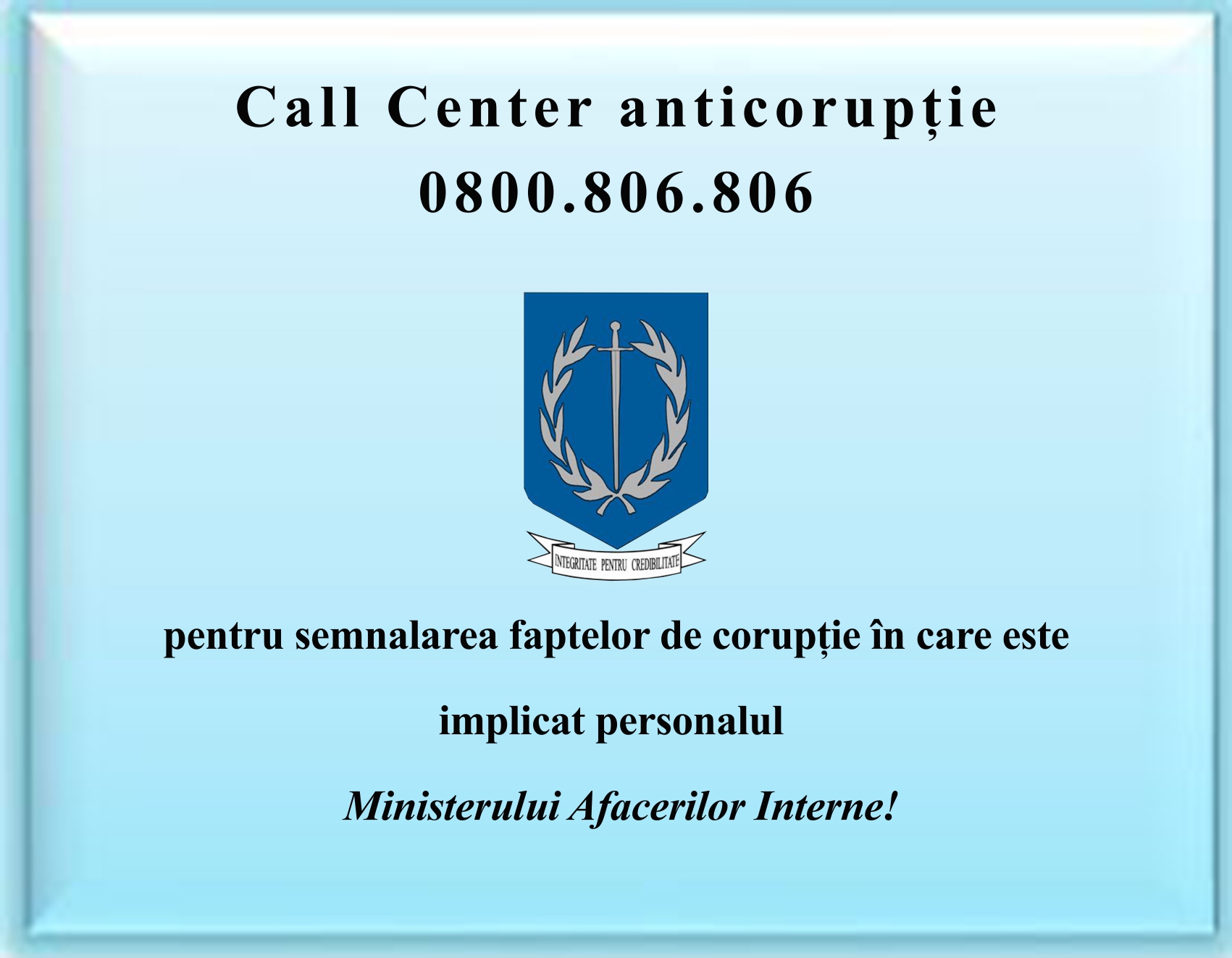 Linia anticorupție a Direcției Generale Anticorupție, 0800.806.806, a fost lansată odată cu operaționalizarea Direcției Generale Anticorupție, respectiv la data de 31 octombrie 2005. Pentru a sesiza...