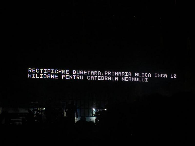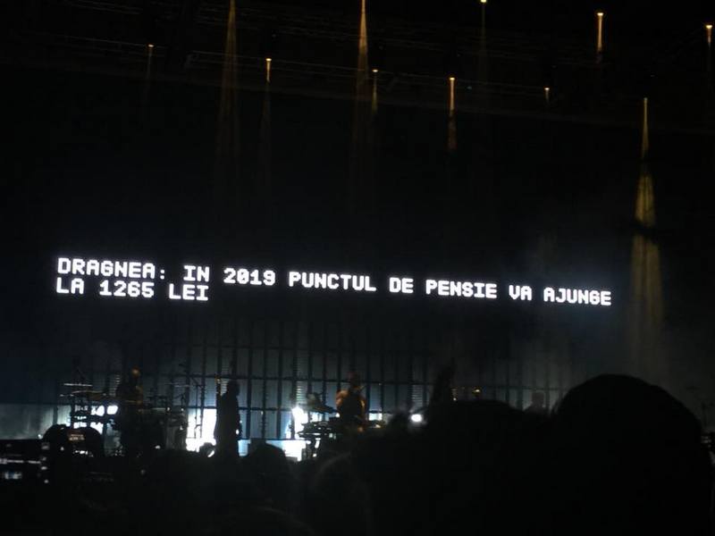 ”Noaptea ca hoții”, ”Campania Fără penali câștigă teren”, ”Dragnea: În 2019 punctul de pensie va ajunge la 1265 lei”, ”Rectificare bugetară: Primăria alocă încă 10 milioane pentru catedrala neamului” – sunt câteva dintre mesajele afișate marți seară de trupa Massive Attack pe ecranele gigantice de la Arenele Romane, unde a susținut un concert, anunță G4media.