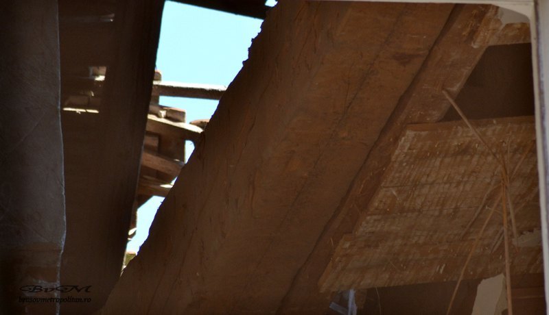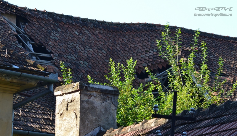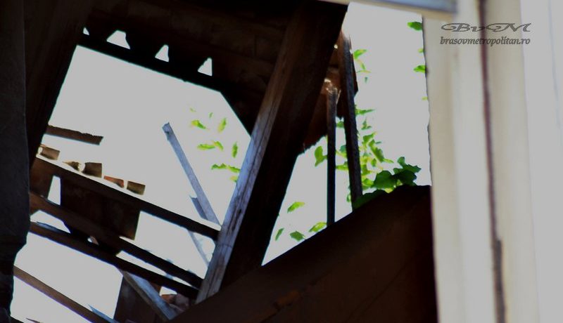 Zilele trecute o porțiune de aproximativ 60 de metri pătrați din acoperiș s-a prăbușit, rupând și tavanul de la ultimul etaj.