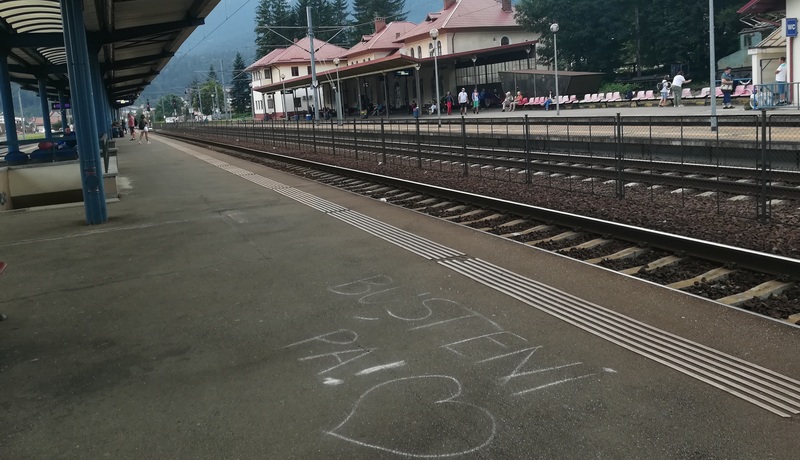 Ajung în Bușteni, unde, mă „lovește în moalele capului” strada care duce la telecabină. O grămadă de „suveniruri” chinezești, așa că o iau pe străduțe secundare pentru a ajunge la gară așa că trec pe lângă mai multe căsuțe „elvețiene”. Plec din Bușteni, nu înainte de vedea un mesaj scris pe peron.