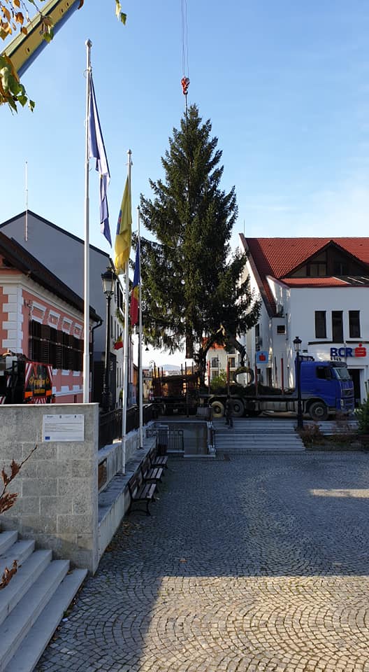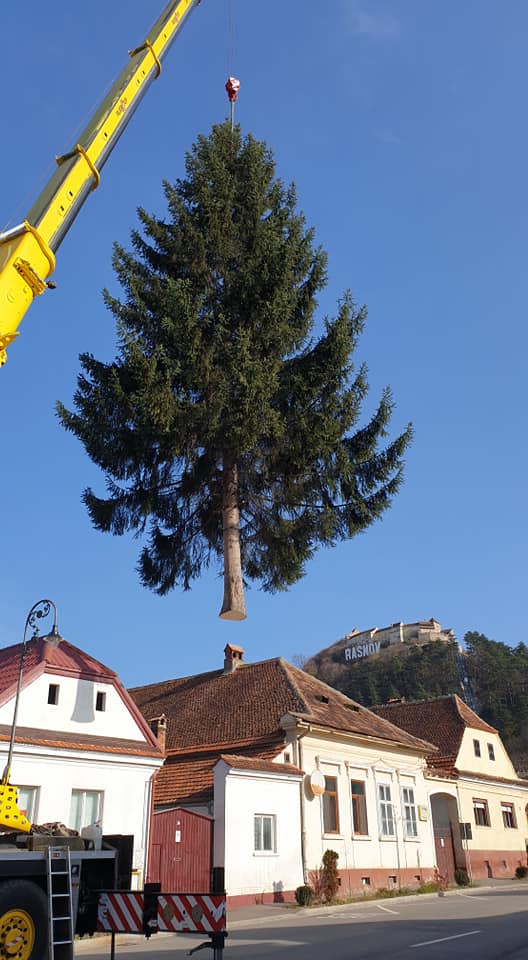 FOTO. Brad de Crăciun de 22 de metri, în centrul Râşnovului. Arborele a fost tăiat din curtea unui localnic
