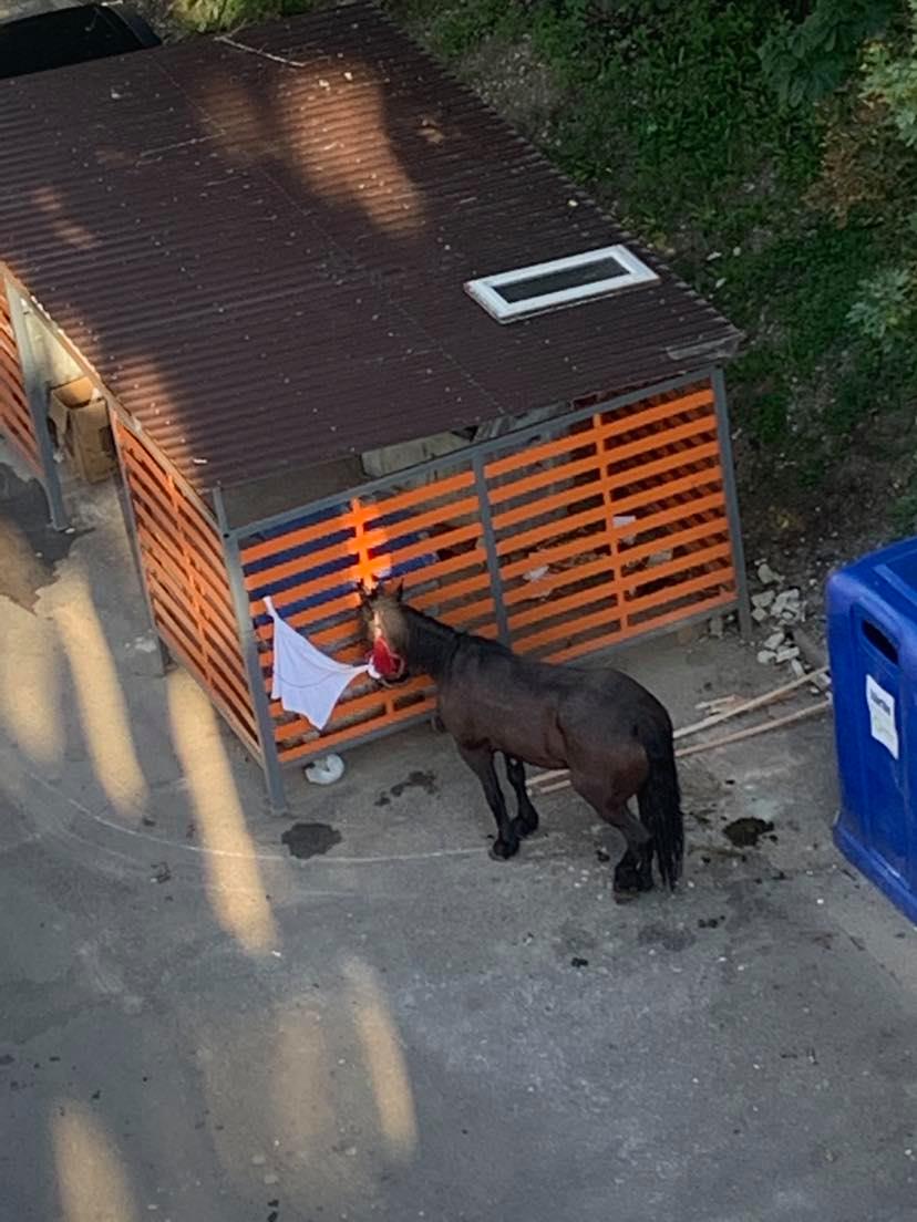 FOTO. Căluţ găsit azi noapte într-un sens giratoriu din Braşov. Poliţiștii locali l-au priponit de o boxă de gunoi