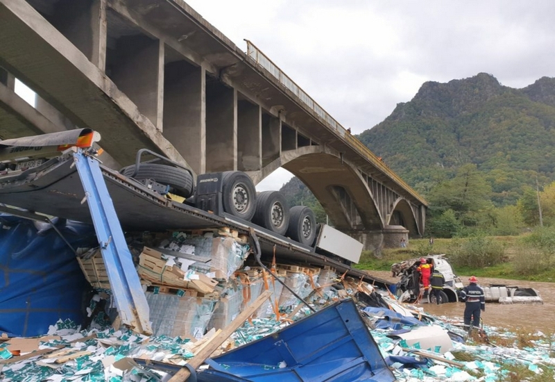 FOTO&VIDEO. Şoferul unui TIR înmatriculat în Braşov a murit în judeţul Vâlcea, după ce s-a prăbuşit peste parapeţii viaductului de peste Lotru