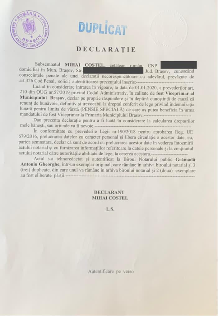 Președintele PMP Brașov, fost viceprimar al municipiului Brașov, a renunțat la pensia specială care i s-ar cuveni conform legii în vigoare. Renunțarea a fost făcută în fața unui notar public. Acum, președintele PMP Brașov, care candidează pentru Senatul României, îi provoacă la același gest și pe alți parlamentari de Brașov care în ultimele zile s-au arătat împotriva pensiilor speciale pentru politicieni și au anunțat că vor demisiona din funcție, înainte de finalizarea mandatului.