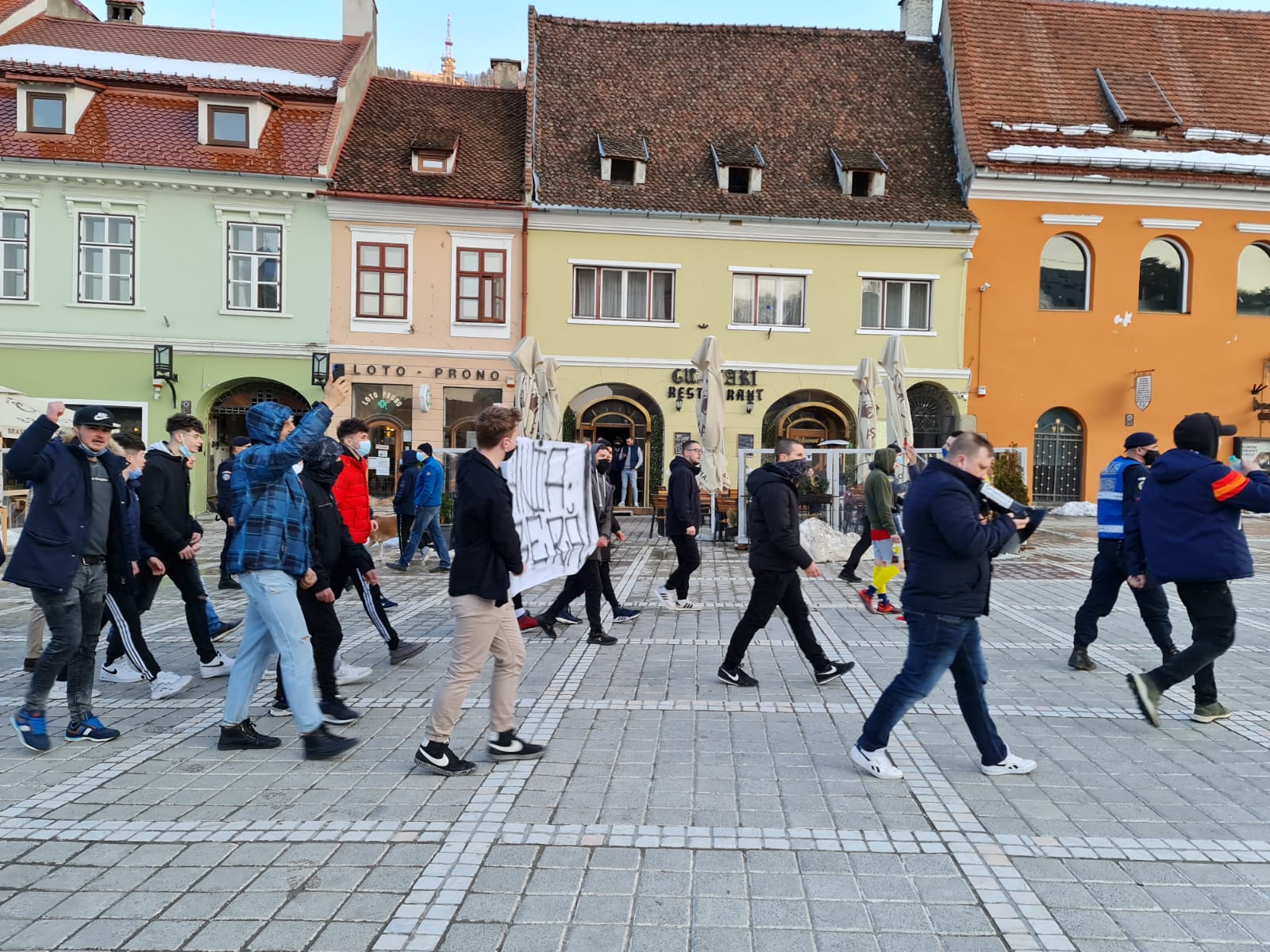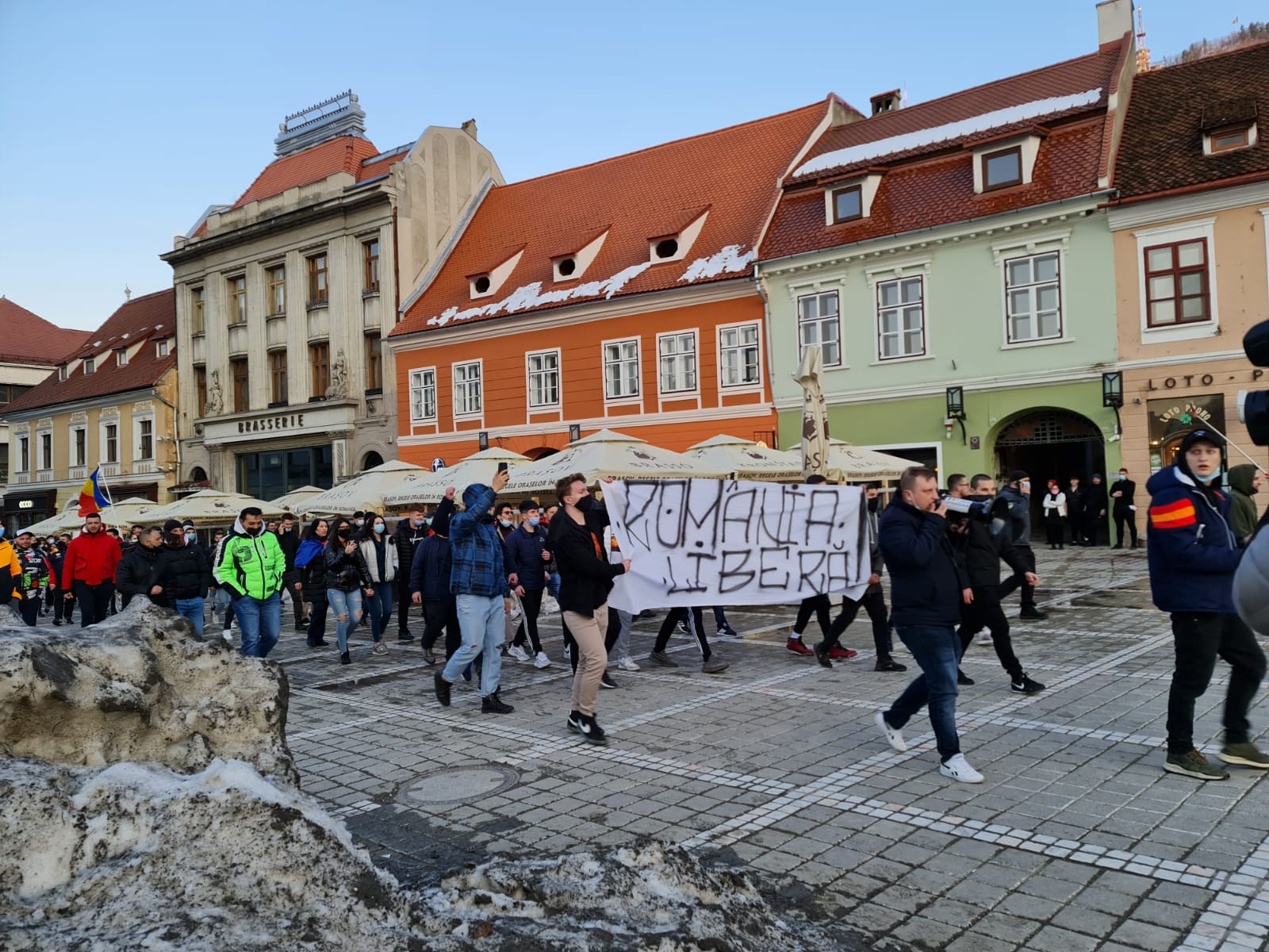 Cele mai des auzite scandări de azi au fost „Jos masca” şi „Libertate”. De altfel, un grup de protestatari s-a plimbat pe străzile din centrul Braşovului, de la Prefectură spre Piaţa Sfatului, cu un banner pe care era inscripţionat mesajul „România liberă”.