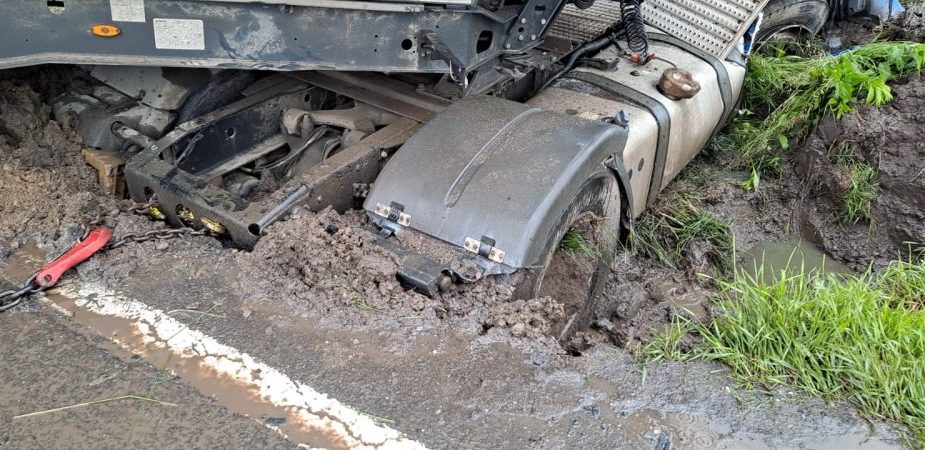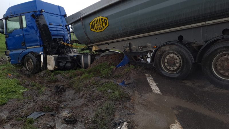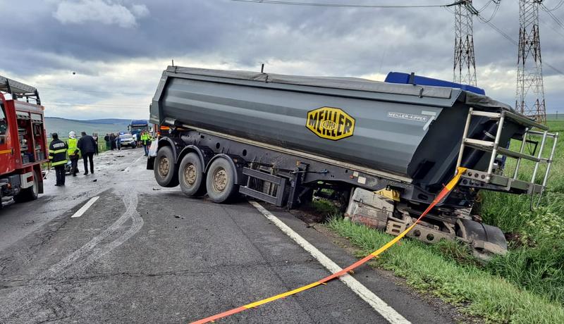 UPDATE – Ora 15.30: La 7 ore de la producerea accidentului, drumarii încă lucrează la scoaterea vehicului de pe carosabil și la deblocarea drumului. Potrivit reprezentanților DRDP, camionul s-a împotmolit în noroi.