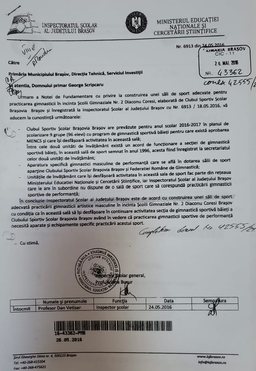 Costel Mihai reaminteşte că ideea construirii unei săli de gimnastică a apărut înainte de începerea mandatului său de viceprimar, în iunie 2016, când părinţii sportivilor care se antrenau în sala veche de la şcoala nr. 2 au făcut o solicitare în acest sens. Inspectoratul Şcolar Judeţean a dat aviz de oportunitate acestei investiţii, sub condiţia ca în viitoarea sală să se poată antrena, după program, şi sportivii care practică gimnastica de performanţă la CSS Braşovia – club aflat în subordinea Ministerului Educaţiei. A urmat realizarea Studiului de Fezabilitate, s-au aprobat indicatorii tehnico-economici, în Consiliul Local, cu unanimitate de voturi şi s-a comandat proiectul tehnic.