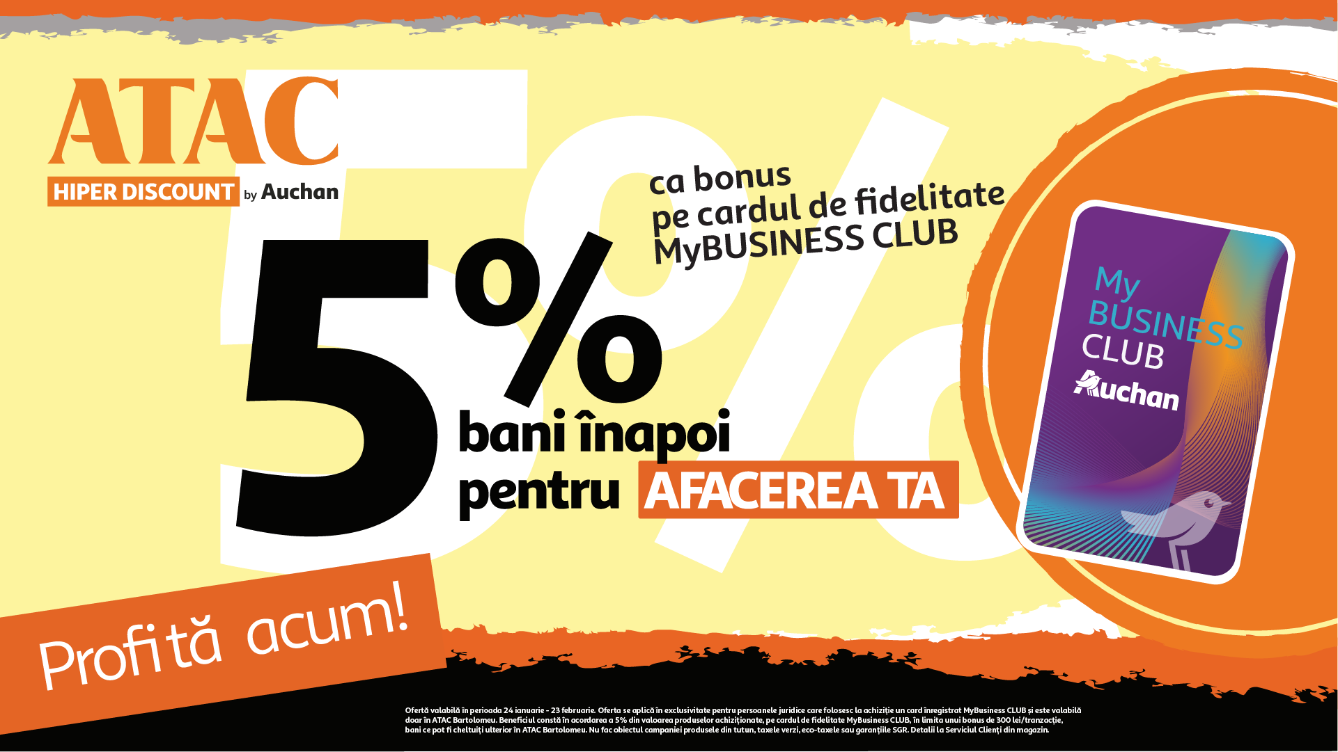 Începând de vineri, 24 ianuarie, și până pe 23 februarie, la ATAC Hiper Discount by Auchan ai 5% bani înapoi pe cardul de fidelitate MyBusiness Club, pentru afacerea ta, dacă ești persoană juridică. În plus, fie că ești persoană fizică sau juridică, tot în magazinul tău preferat, care te așteaptă zilnic cu prețuri mici, vei găsi prețuri în cascadă incredibile la produse esențiale, precum fructe și legume, făină, cafea, gata de a fi descoperite. Grăbește-te să prinzi prețurile de neegalat!