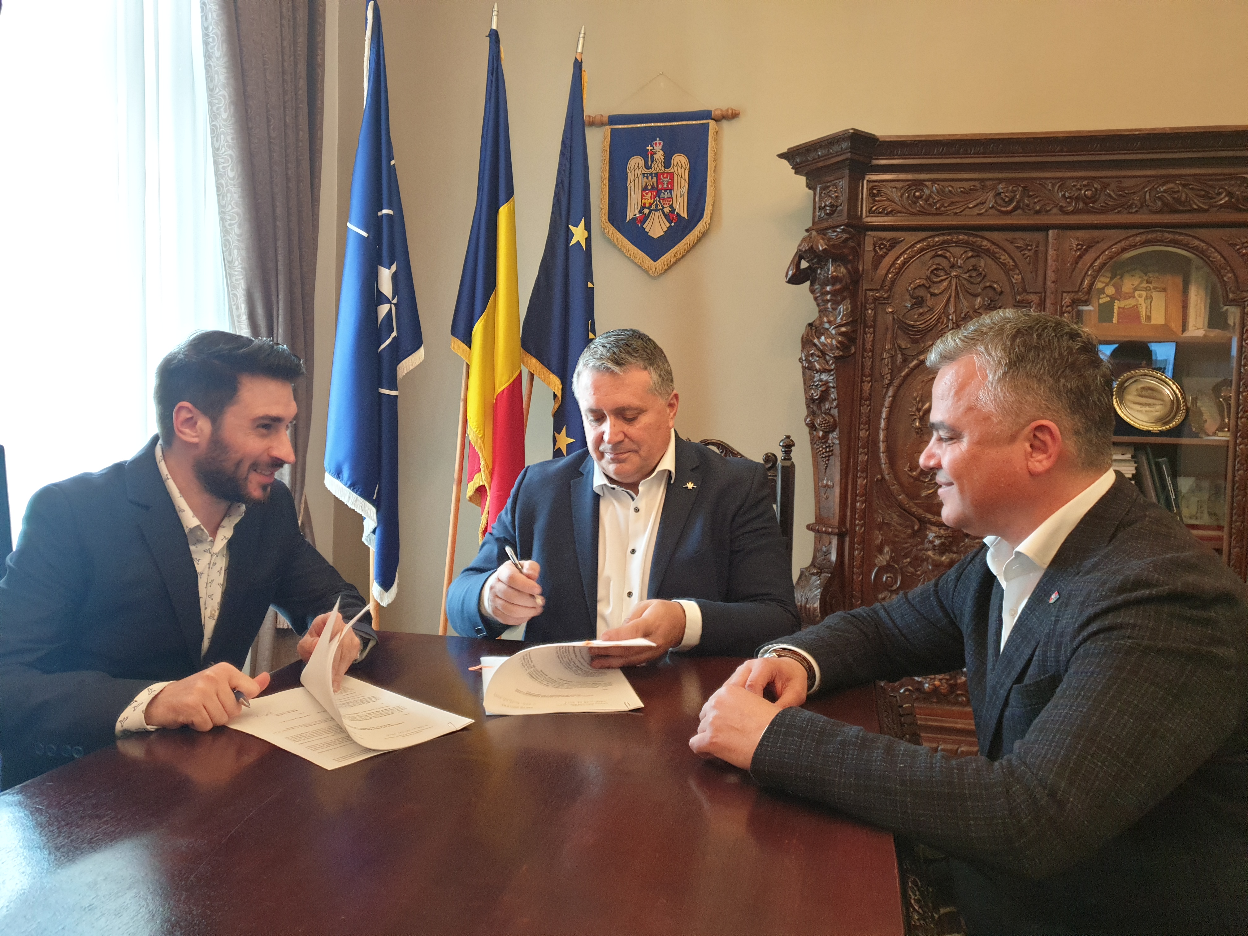Regia Autonomă „Aeroportul International Braşov-Ghimbav” – în calitate de Aeroport, reprezentată de directorul general Alexandru Anghel, şi DAN AIR (AOC) SRL – în calitate de Transportator, prin directorul general Matt Ian David au semnat luni primul contract de prestări servicii aeroportuare – pentru exploatarea AIBG.