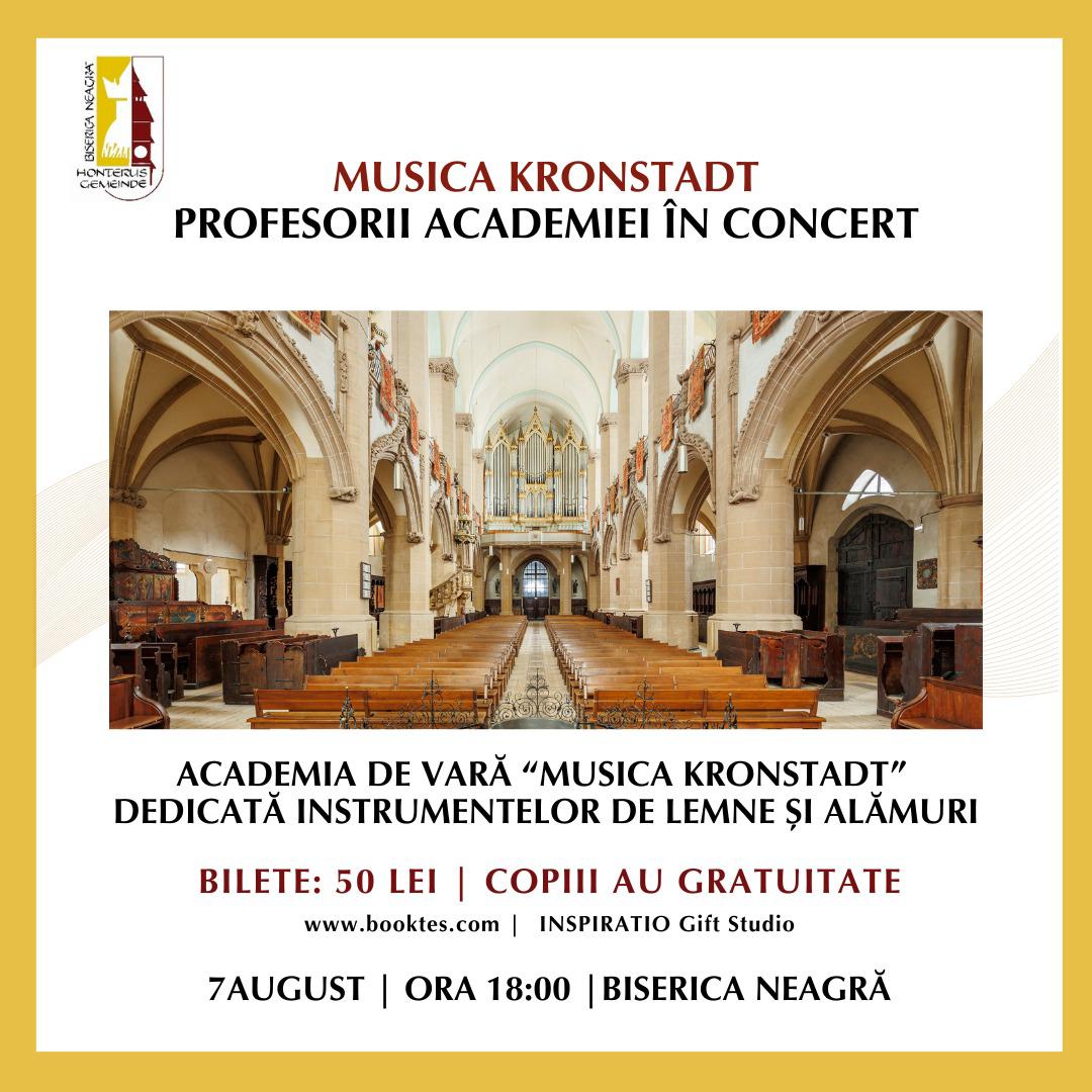În 7 august, profesorii Academiei de Vară „MUSICA KRONSTADT” vor susține un concert, sub forma unui dialog muzical antrenant, într-un spațiu emblematic al Brașovului – Biserica Neagră. Publicul va avea ocazia să audieze compozitori ca Johann Sebastian Bach, Henri Tomasi, Vincenzo Bellini, Mark Wolfram, Jean-Baptiste Loeillet, Tomaso Giovanni Albinoni, Georg Philipp Telemann, Eithne Ní Bhraonáin. Artiștii vor interpreta piese la orgă și la intrumente de suflat, atât de lemn (flaut, oboi, clarinet și fagot), cât și de alamă (trompetă, corn, trombon și tubă). Muzica de orgă va fi interpretată de Steffen Schlandt, organistul și dirijorul Corului Bach al Bisericii Negre. Piesa Only Time, compusă de Eithne Ní Bhraonáin (Enya), va uni, în finalul concertului, toate instrumentele de suflat, sub bagheta prim-oboistului și dirijorului, Adrian Petrescu.
