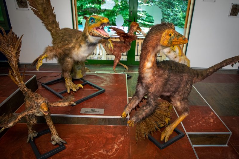 Expoziția cuprinde zece reconstituiri artistice ale unor scene inspirate de excepționalele descoperiri din provincia chineză Liaoning din anii `90, care, prin abundența tipurilor de dinozauri cu pene și modul extraordinar de conservare, au bulversat lumea științifică, oferind răspunsuri la o serie de întrebări legate de originea păsărilor.