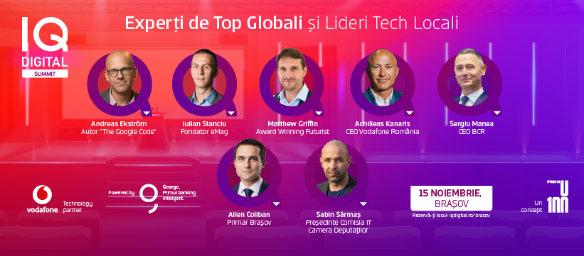 - IQ DIGITAL Summit Brașov reunește experți tech și de business: scriitorul și consultantul Andreas Ekstrom, futurologul Matthew Griffin, Iulian Stanciu, unul dintre cei mai cunoscuți și apreciați antreprenori în e-commerce din România, Sergiu Manea – CEO BCR, Achilleas Kanaris – CEO Vodafone România, precum și liderii unor companii cu amprentă locală și experți IT, care vor discuta despre transformarea digitală a ecosistemului antreprenorial românesc.