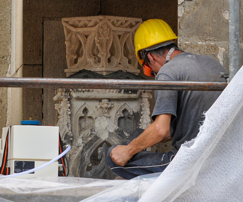 Restaurarea constă în aplicarea tratamentelor preventive de biocidare, îndepărtarea coloniilor de licheni aderente la suprafața pietrei, ancorarea cu mortar a unor fragmente aflate în pericol de desprindere, integrarea cromatică a elementelor din piatră mai deschise decât originalele, protejarea împotriva apei și montarea unor sisteme de protecție împotriva porumbeilor.