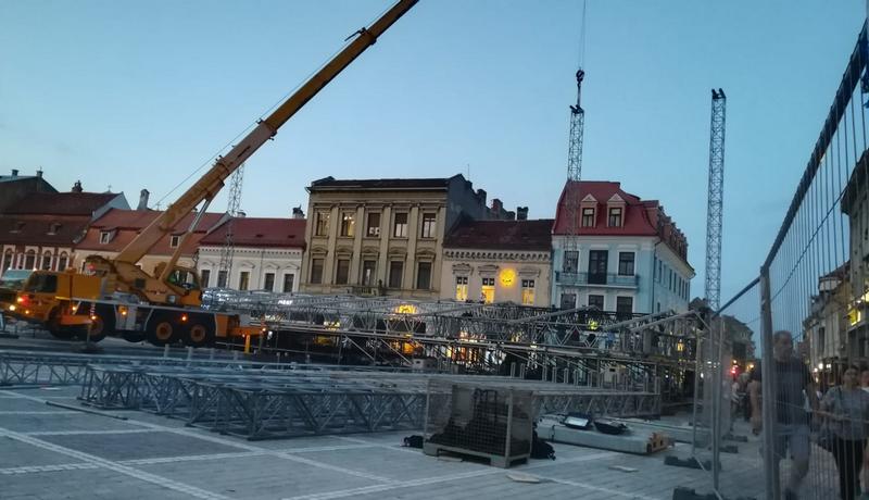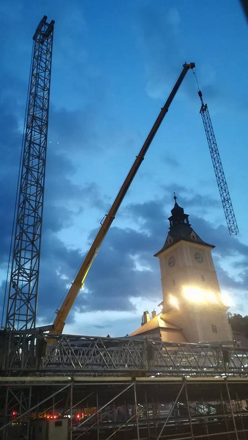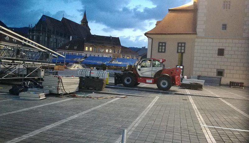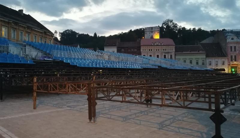 Intrați sâmbătă pe șantier, muncitorii care amenajează Piața Sfatului lucrează acum la foc continuu, pentru a termina în timp util lucrările. De altfel, termenul este strâns, pentru că până în prima zi a festivalului, adică pe 29 august, trebuie să fie terminate gradenele, montată scena, inclusiv sisteme de sonorizare și de lumini.