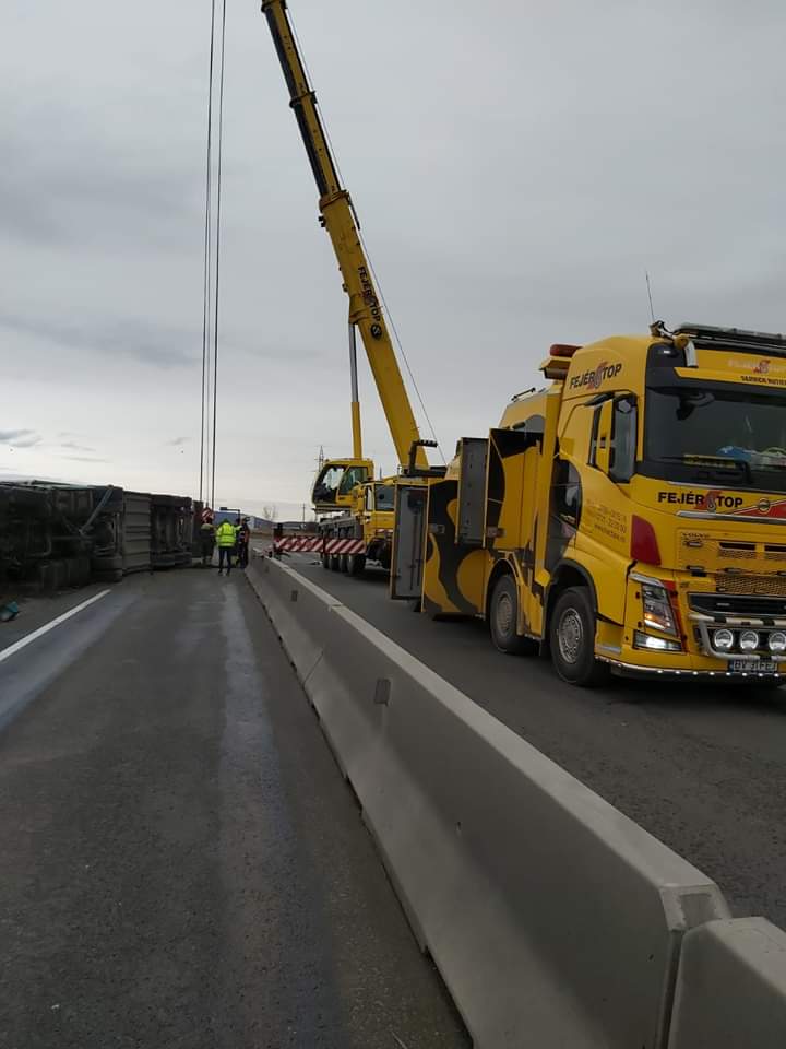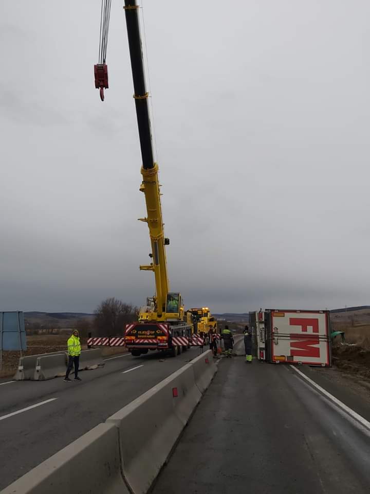 FOTO. Circulație blocată pe DN13 la Hoghiz, din cauza unui TIR răsturnat pe carosabil