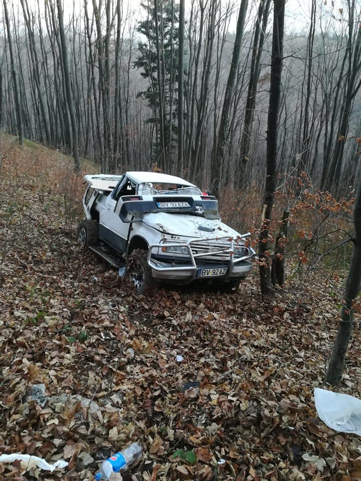 Potrivit pompierilor din Codlea, autoturismul offroad s-a răsturnat într-o râpă pe un traseu montan în zona Poiana lui Sulică – Valea Lată de pe Măgura Codlea.
