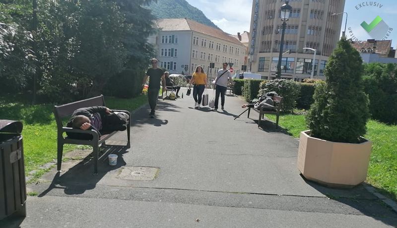 Dormind…la Primărie. Oamenii străzii din Braşov au ajuns să îşi facă veacul nestingheriţi oriunde în oraş. În mod curent, ei pot fi văzuţi dormind, bine-mersi, pe băncile de pe alei sau chiar pe cele de la locurile de joacă. .