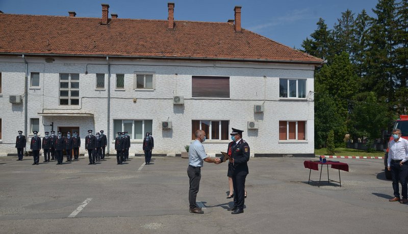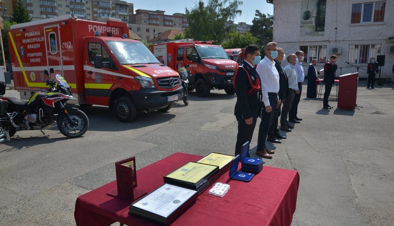„Astăzi, pe lângă faptul că aniversăm cei 84 de ani de la înființarea primei companii de pompieri militari, au fost acordate diplome de onoare colegilor noștri care au trecut în rezervă, după o fructuoasă activitate în rândurile noastre, distincții unui număr de șase colegi pentru misiunile deosebite – mai ales în perioada aceasta, de COVID – desfășurate pe raza întregului județ Brașov, și nu în ultimul rând, au fost înmânate embleme de merit pentru persoanele care au contribuit la buna desfășurare a activităților ISU Brașov, printre care enumerăm pe domnul Joliff Erwan, șeful SVSU de la Ticuș, care a înființat formațiunea de pompieri a orașului satului Cobor de unde se poate interveni în patru comune, de asemenea pe domnul primar Marcel Pelei, din comuna Homorod, care, împreună cu noi și consiliul județean, a realizat un punct de lucru în zona de nord a județului, care era o zonă neacoperită de către forțele ISU, și nu în ultimul rând pe domnul George Scripcaru, prin care am avut sprijinul pentru achiziționarea, de către municipiul Brașov, a două autospeciale de intervenție în zone înguste și zone de munte – incendii de pădure, cât și a unui ATPVM (Autospecială pentru transport personal și victime multiple, n.n.) pentru transport de persoane înalt contagioase“, a spus locotenent-colonelul Lucian Marciu, inspector-şef al ISU Braşov.
