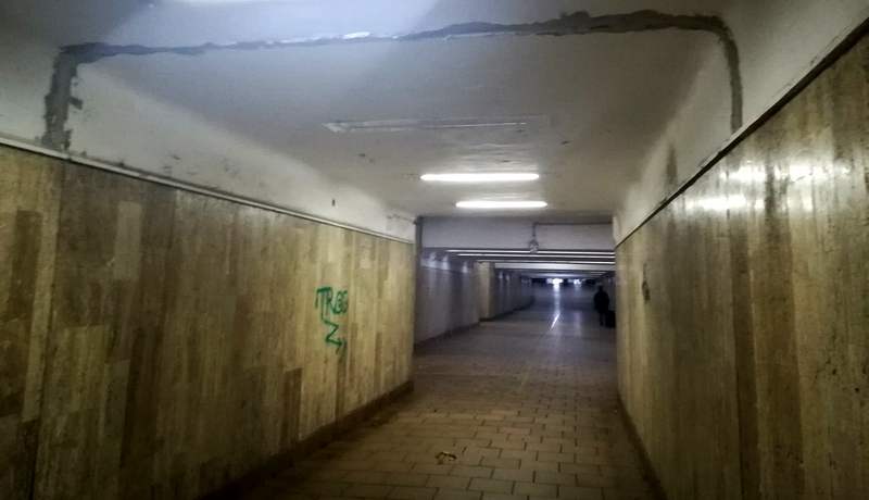 Nu este nimic grav, am văzut că s-a și remediat. Era doar un strat subțire de tencuială la rostul între tronsoanele pasajului subteran. Nu pune în pericol stabilitatea și rezistența construcției.