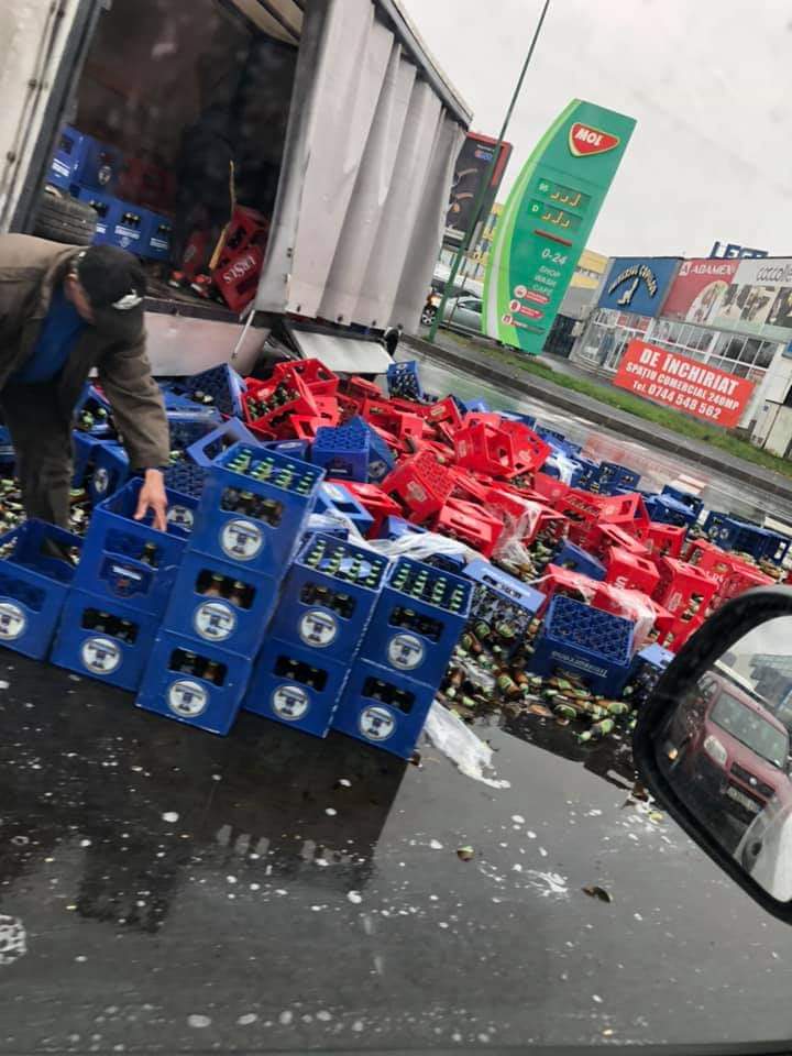 Zeci de lăzi cu sticle de bere au căzut azi, în jurul prânzului într-un sens giratoru de la Bartolomeu. Incidentul s-a produs din cauza unei manevre greșite a șoferului ce conducea camioneta cu prelată în care se aflau lăzile.