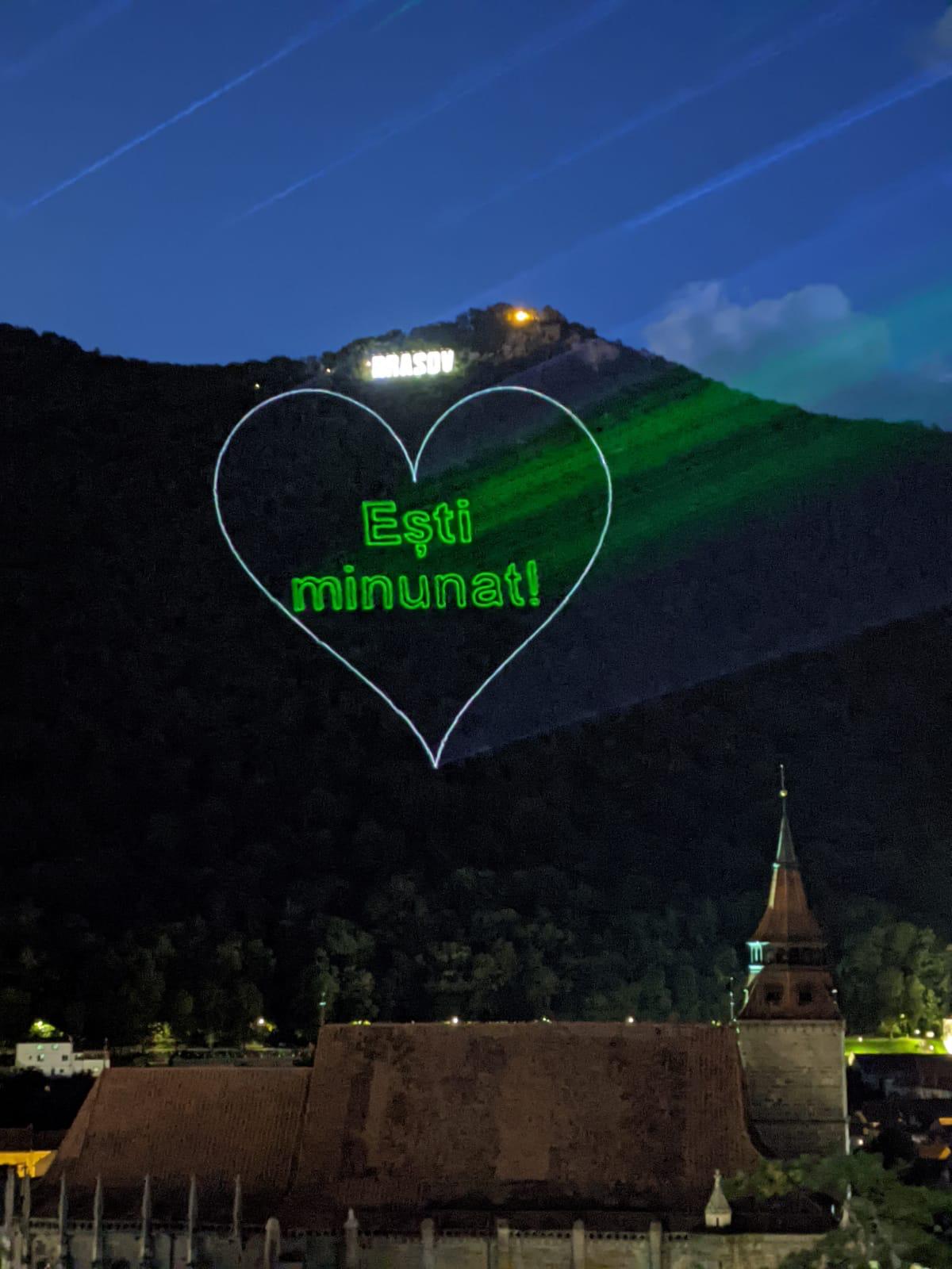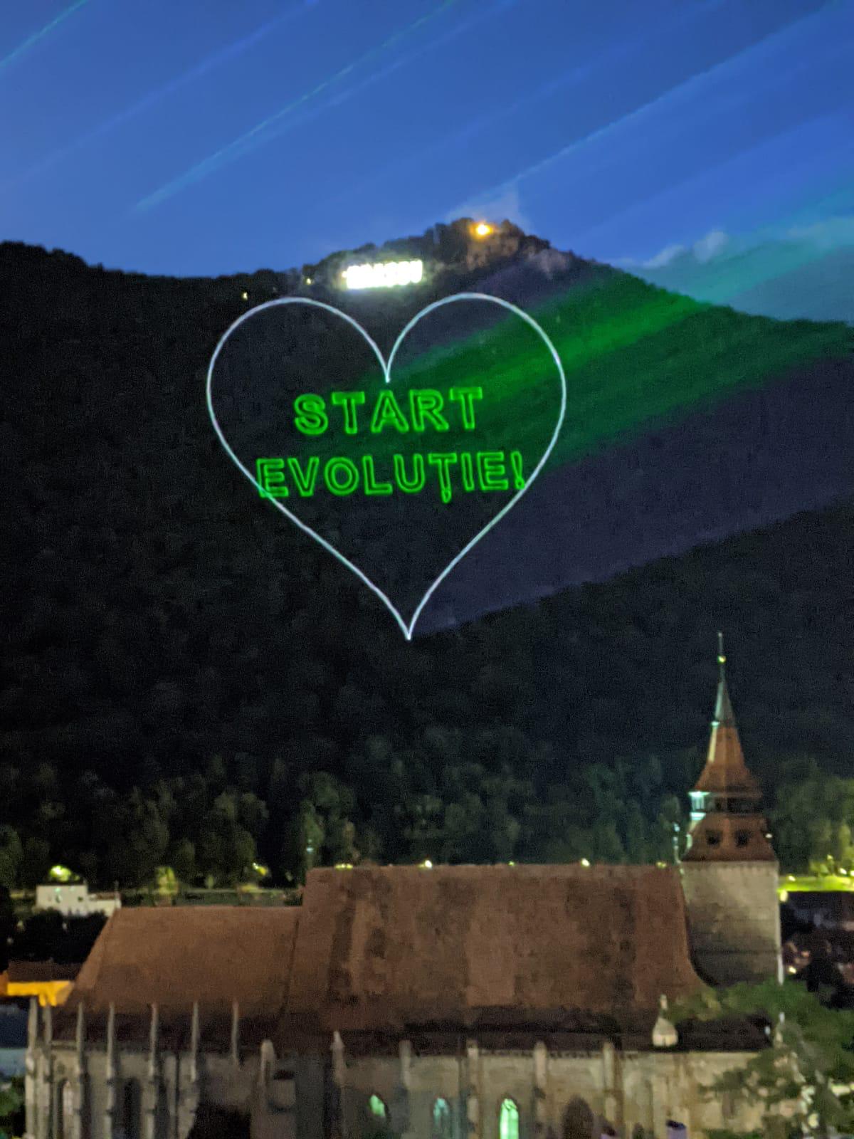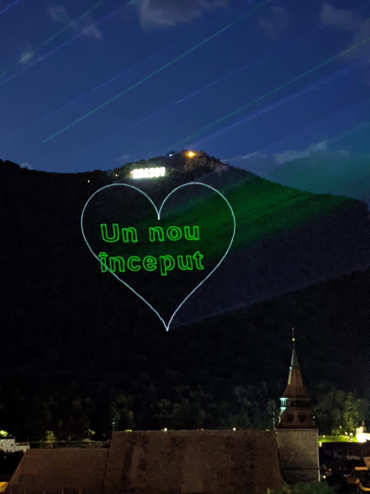 Brașovenii au fost primiți, în această seară, în Piața Sfatului cu o serie de proiecții de laser, cu mesajele „Un nou început”, „Braşov, esti minunat”, „Start evoluţiei”. Proiecţiile au fost realizate pro bono de către Victor Lenghe de la LaserConexiuni.