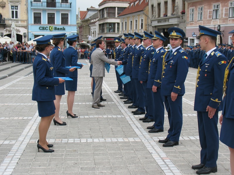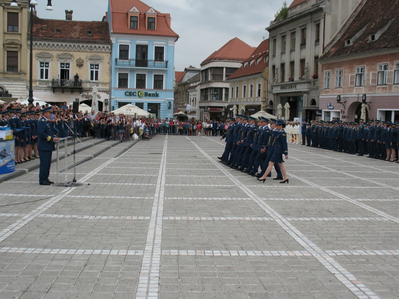 Absolvenții Academiei Forțelor Aeriene Henri Coandă și-au primit vineri, în Piața Sfatului diplomele de absolvire. Ca în fiecare an, promoția a primit și un nume, pentru acest an fiind aleasă denumirea „Centenarul Marii Uniri”. A fost ultima dată când noii aviatori, rachetiști sau meteorologi, foști studenți ai Academiei, au fost în dispozitiv complet.