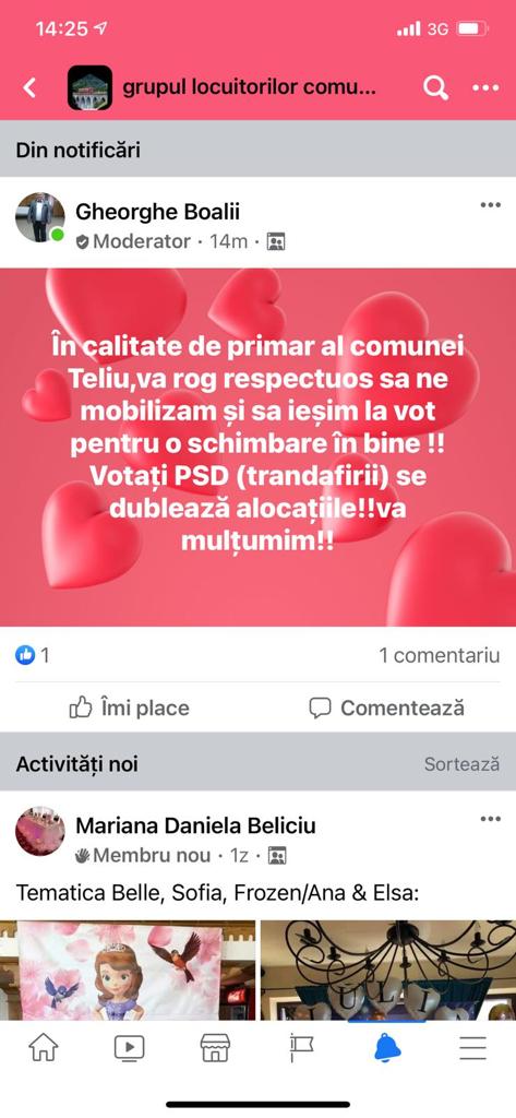 Primarul comunei Teliu, Gheorghe Boalii îi îndeamnă pe alegătorii din comună, prin mesaje postate de Facebook, să voteze PSD pentru dublarea alocaţiilor. Edilul face aceste îndemnuri de campanie chiar în ziua alegerilor deşi campania electorală s-a finalizat, conform legii sâmbătă la ora 7.00.
