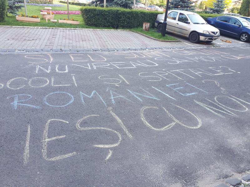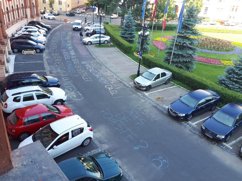 Parcarea din fața clădirii a fost umplută cu mesaje scrise cu creta, probabil încă de aseară, de câțiva protestatari, pentru reprezentanții administrației brașovene și nu numai.