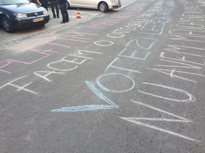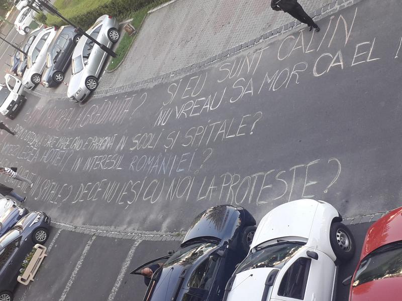 FOTO. Surpriză matinală. Mesajele protestatarilor pentru oficiali, pe asfaltul din parcarea Prefecturii Brașov