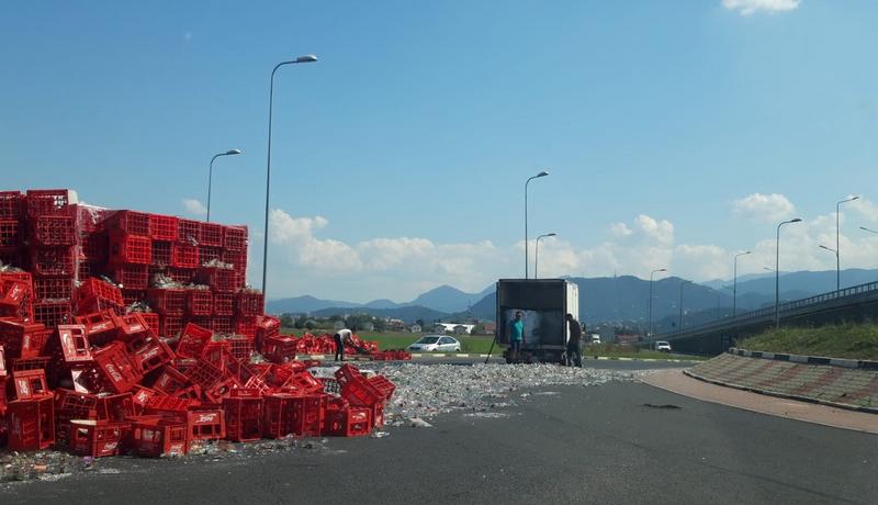 FOTO. Sute de sticle sparte, împrăștiate pe Ocolitoarea Brașovului, după ce un TIR s-a răsturnat în giratoriul de la strada Lânii