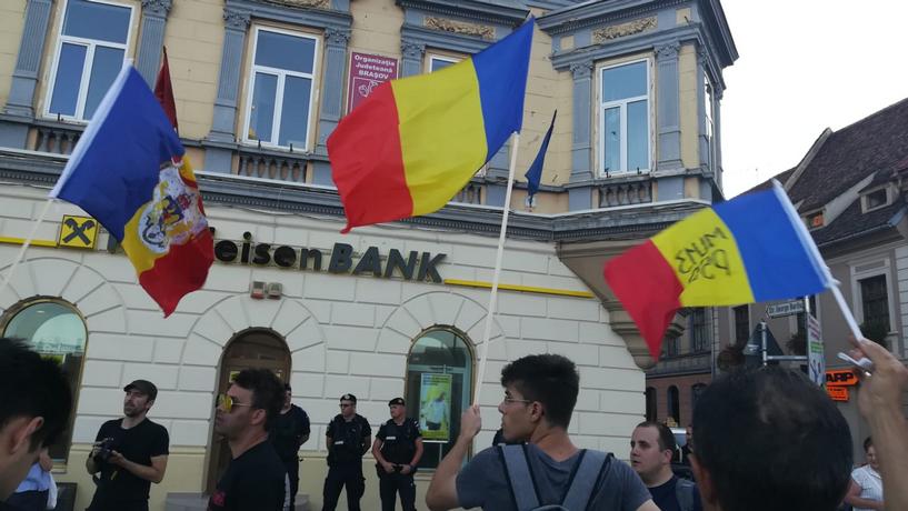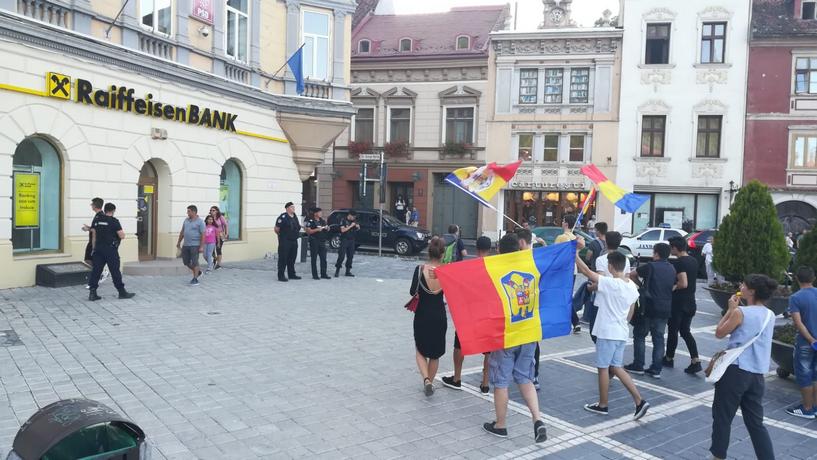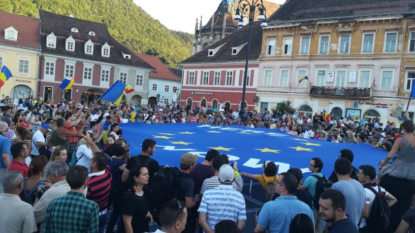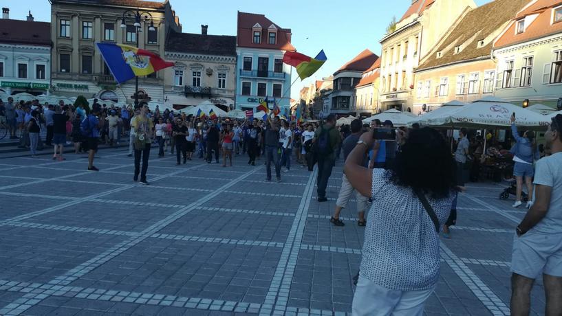 UPDATE 19.30 – În Piața Sfatului, protestatarii au întis un steag al Uniunii Europene. După câteva minute în punctul zero al Brașovului, grupul de protestatari a început marșul pe strada Mureșenilor, înapoi spre zona Prefecturii. De acolo, vor să meargă pe bulevardul 15 Noiembrie și pe Victoriei, spre zona Gării.