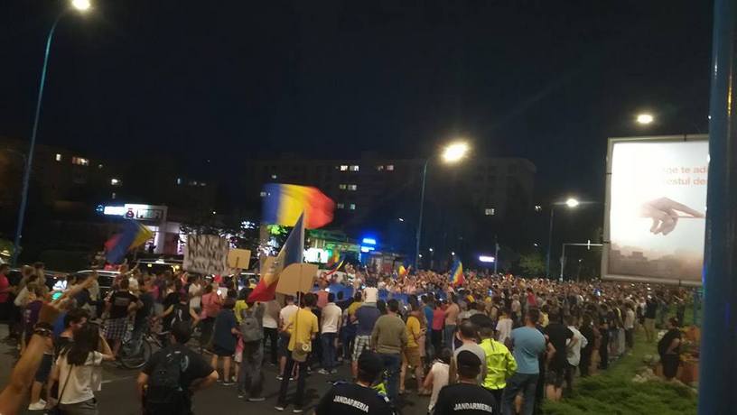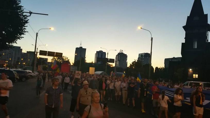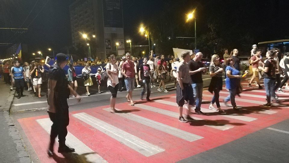 UPDATE 21.00 – Numărul protestatarilor a depășit 2.500. Oamenii se îndreaptă spre bulevardul Victoriei, pe bd. 15 Noiembrie. În zona Camerei de Comerț și Industrie, circulația s-a blocat complet câteva minute, pentru trecerea grupului de pe o parte pe alta a drumului. Protestatarii ocupă acum aproape tot bulevardul, o singură bandă fiind lăsată șoferilor.