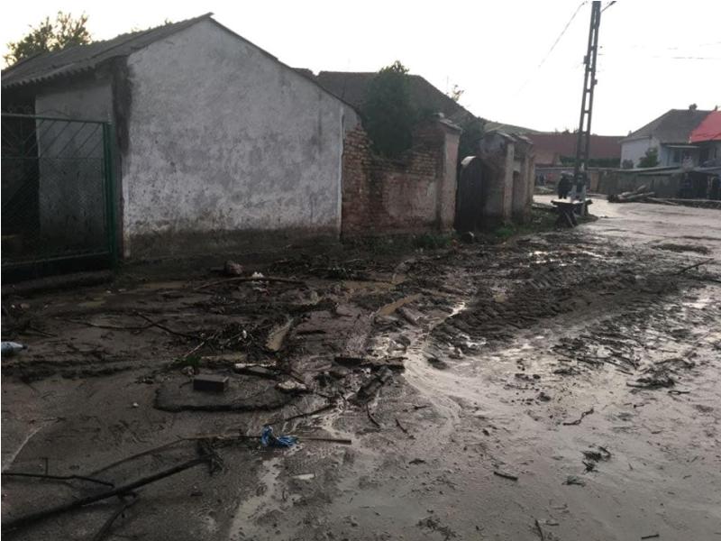 Pe drumurile din comună s-au format adevărate râuri, care au „luat pe sus“ inclusiv mașini parcate pe marginea străzii.