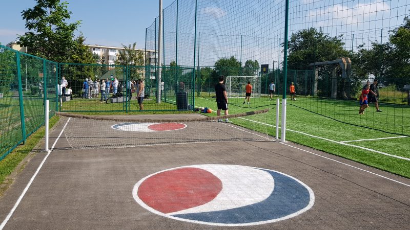 Bucuria copiilor din zonă este însă fostul teren de fotbal, care a fost el modernizat. Terenul din asfalt a fost înlocuit cu unul nou, cu gazon artificial de ultimă generaţie, din polietilenă. Firma care se ocupă de amenajare dă garanţii că acest teren artificial are o durată de viaţă de minim opt ani şi respectă toate cerinţele certificării FIFA minim două stele.